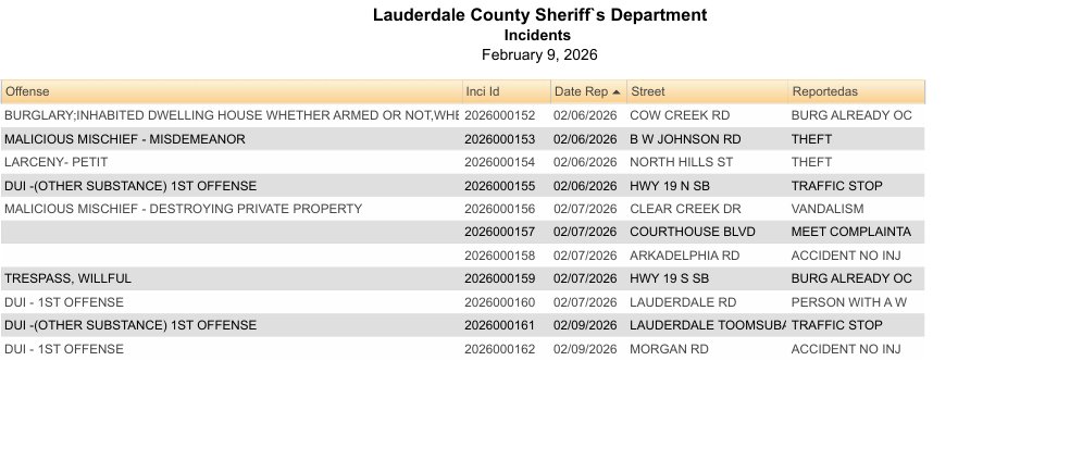 Lauderdale County Arrest Report 2-10-26