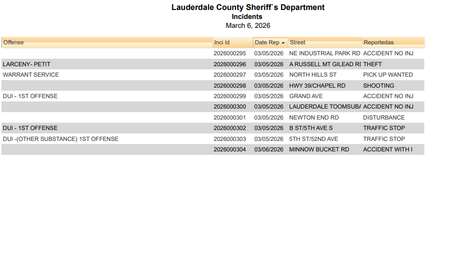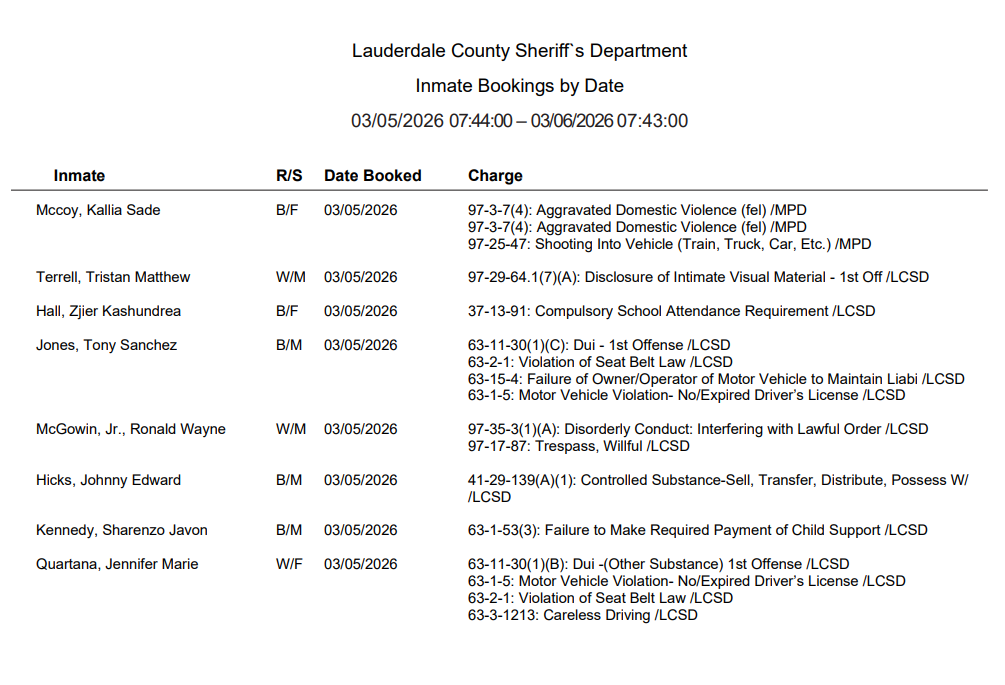Lauderdale County Arrest Report 3-6-26
