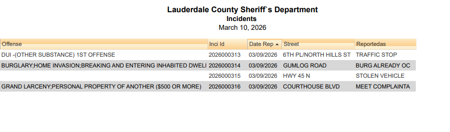 Lauderdale County Arrest Report 3-10-26