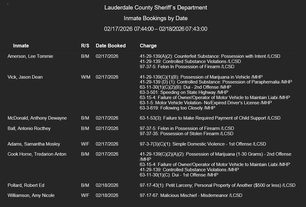 Lauderdale County Arrest Report 2-17-26