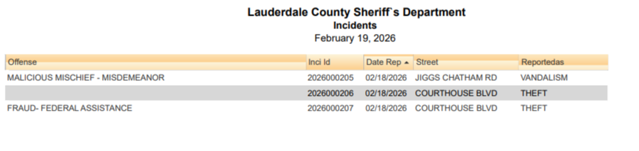 Lauderdale County Arrest Report 2-19-26