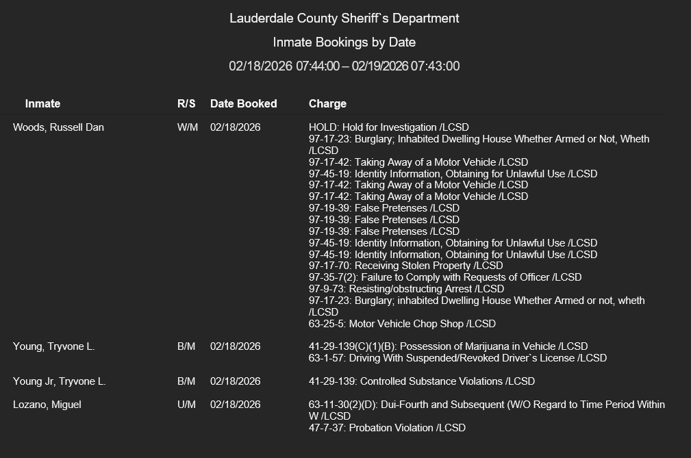 Lauderdale County Arrest Report 2-18-26