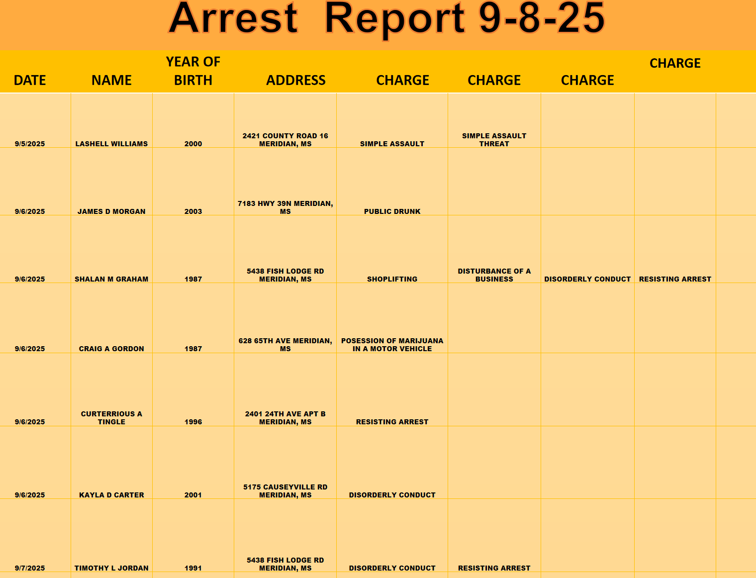At 9:27 AM on September 6, 2025, Meridian Police responded to a stolen vehicle in the 4500 block of Highway 39 North. The case is currently under investigation.