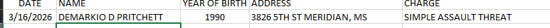 Meridian Police Department Arrest Report 3-17-26