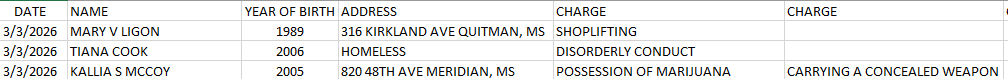 Meridian Police Department was requested to respond to 111 calls for service from March 3, 2026 at 6:00 AM to March 4, 2026 at 6:00 AM.