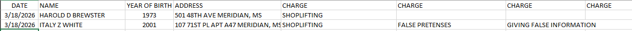Meridian Police Department Arrest Report 3-19-26
