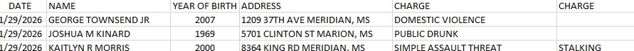 Meridian Police Department Arrest Report 1-30-26