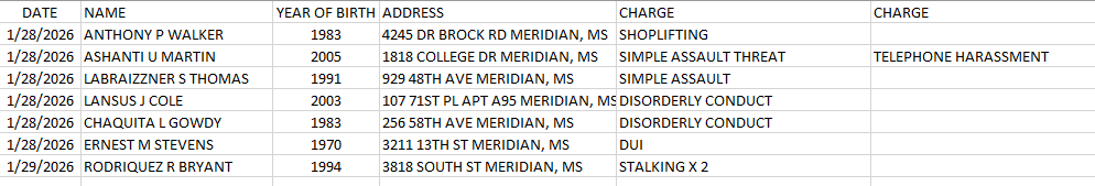 Meridian Police Department Arrest Report 1-29-26