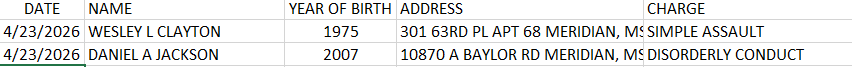 Meridian Police Department Arrest Report 4-24-26