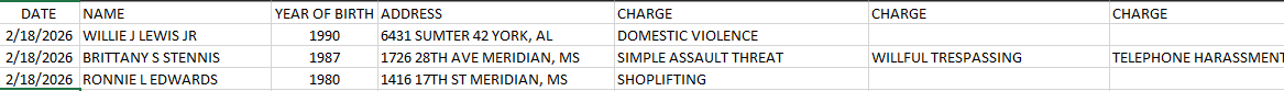 Meridian Police Department was requested to respond to 119 calls for service from February 18, 2026 at 6:00 AM to February 19, 2026 at 6:00 AM.