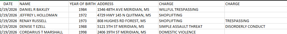 At 4:32 PM on February 19, 2026, Meridian Police responded to a stolen vehicle in the 7100 block of Highway 80 West. The vehicle was recovered for another agency.
