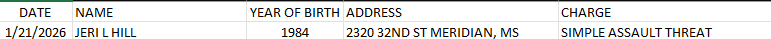 Meridian Police Department Arrest Report 1-22-26