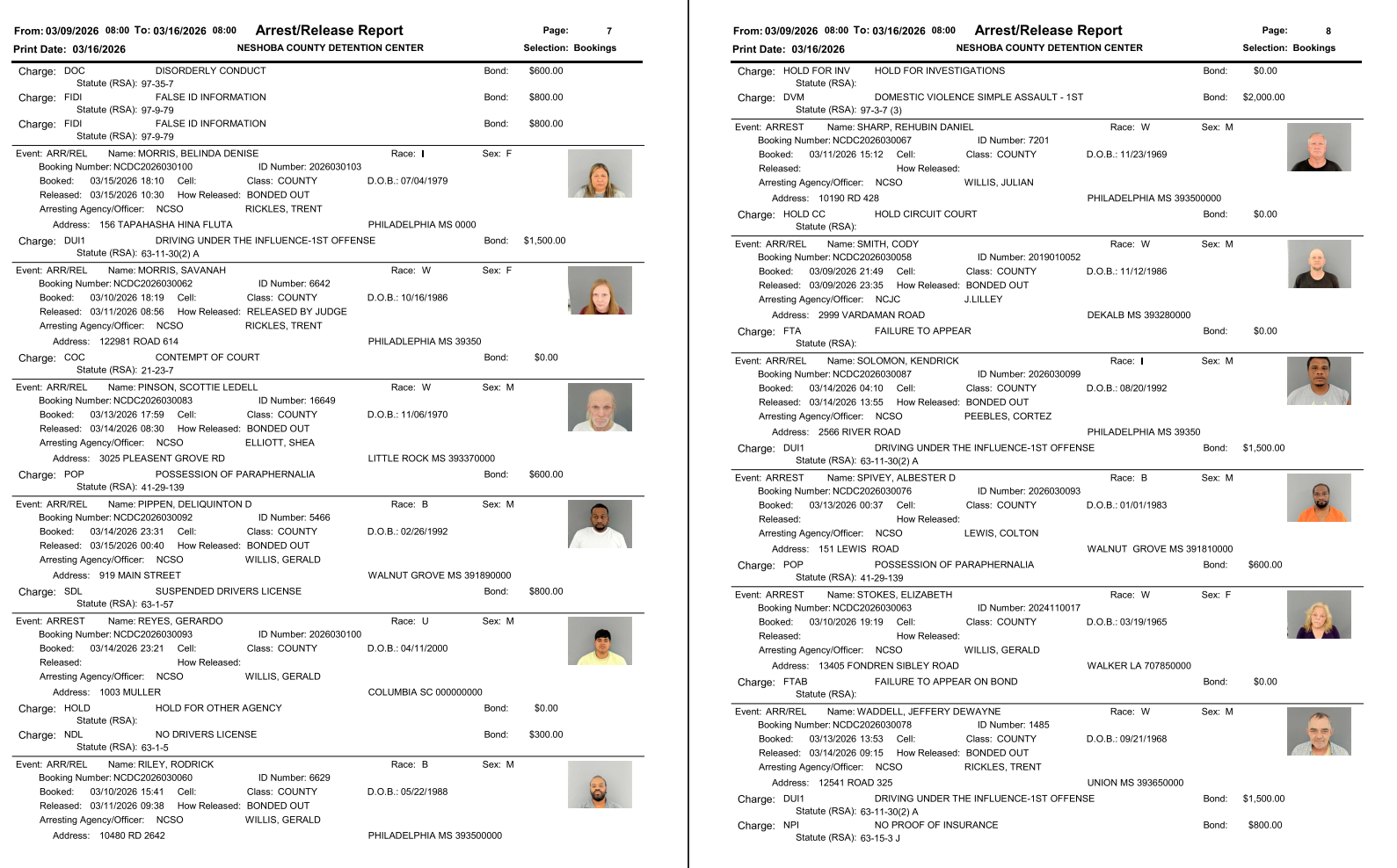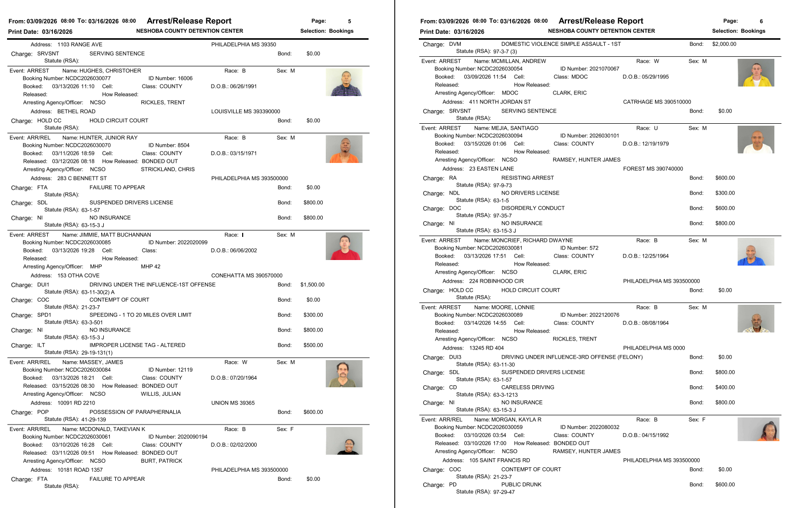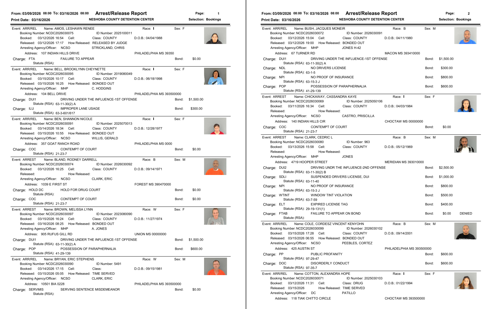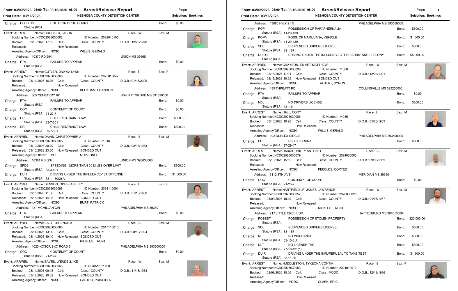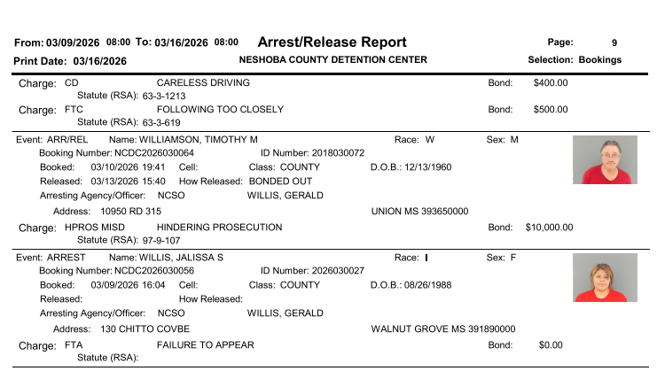 Neshoba County Arrest Report 3-16-26