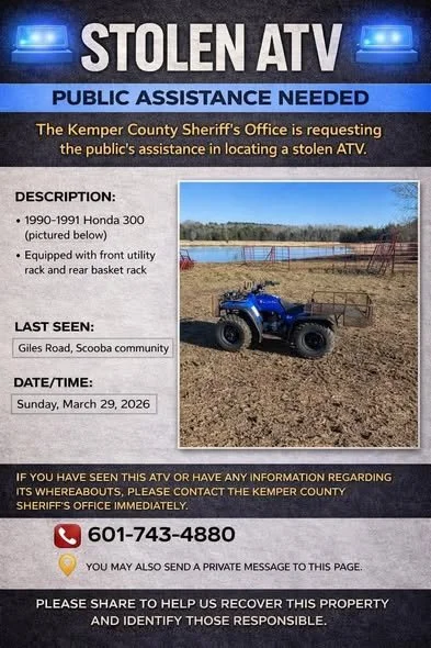 Kemper County Sheriff’s Office is requesting the public’s assistance in locating this stolen ATV, last seen on Sunday, March 29, 2026, in the Giles Road area of the Scooba community.