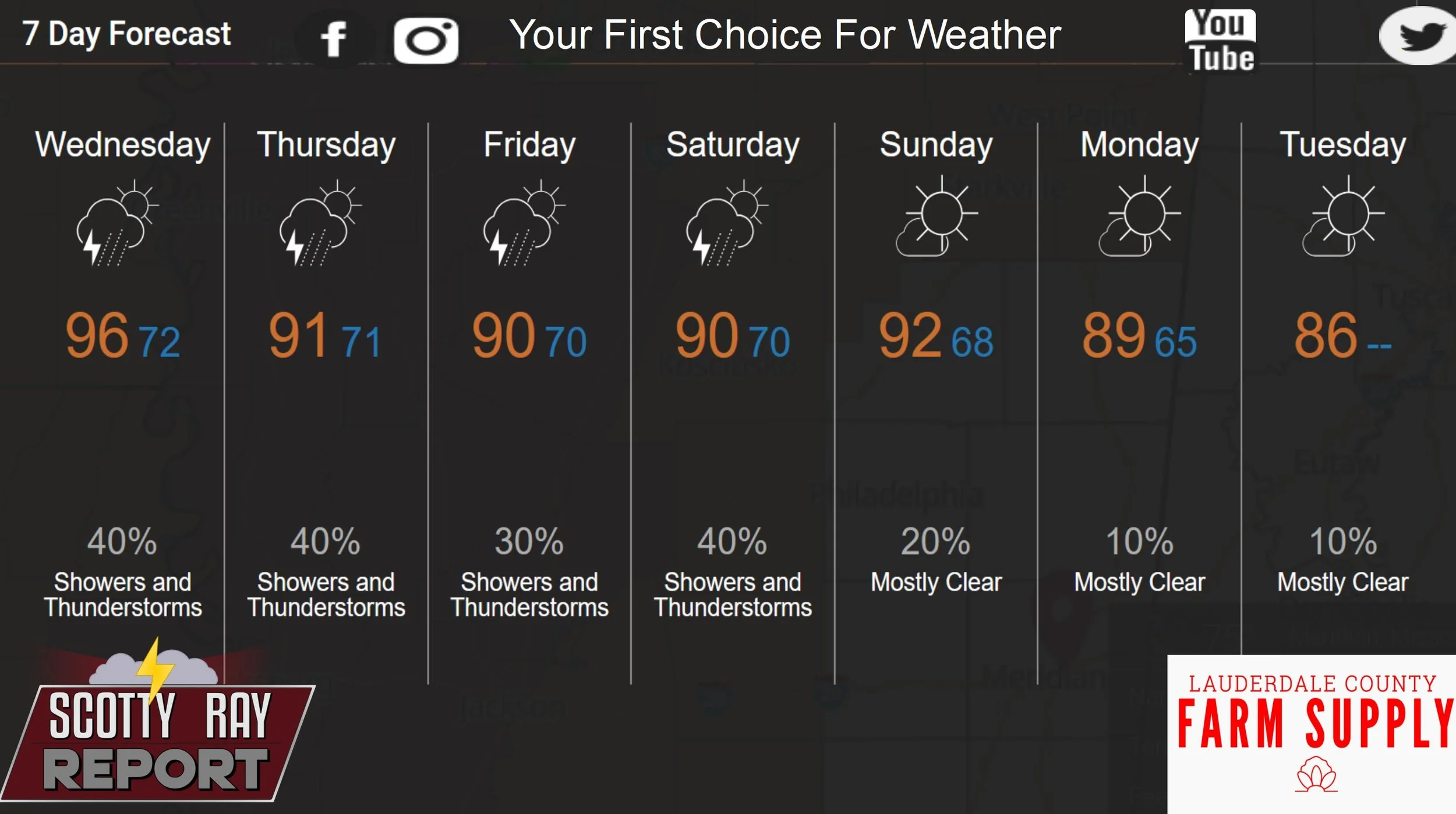 A 30 percent chance of showers and thunderstorms, mainly after 2pm. Sunny and hot, with a high near 98. Heat index values as high as 104. Calm wind becoming north northwest around 5 mph in the afternoon.