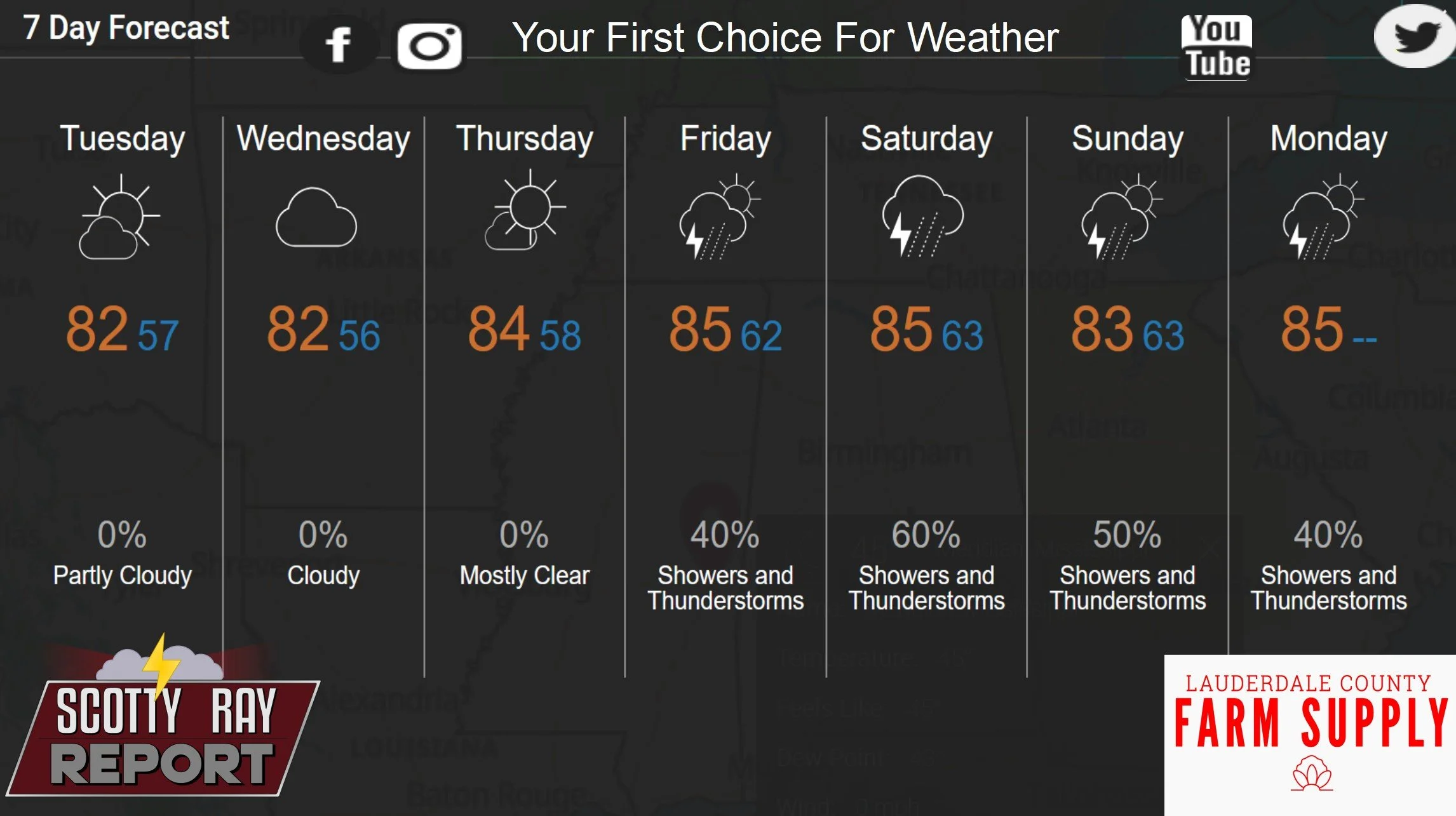 Showers likely and possibly a thunderstorm. Mostly cloudy, with a high near 85. Southwest wind 5 to 10 mph. Chance of precipitation is 60%.