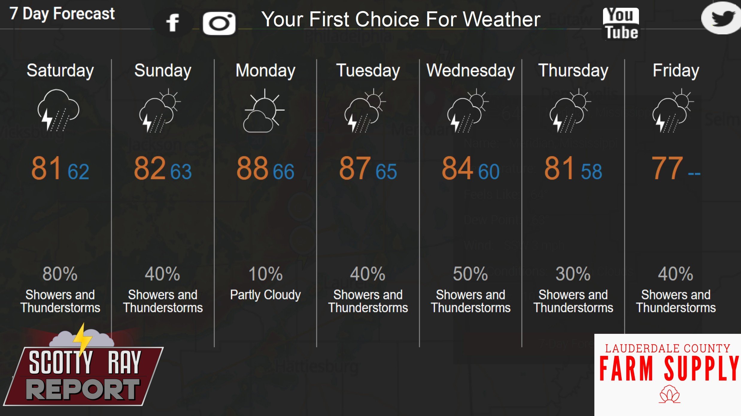A 40 percent chance of showers and thunderstorms. Partly sunny, with a high near 88. South southwest wind 5 to 10 mph.