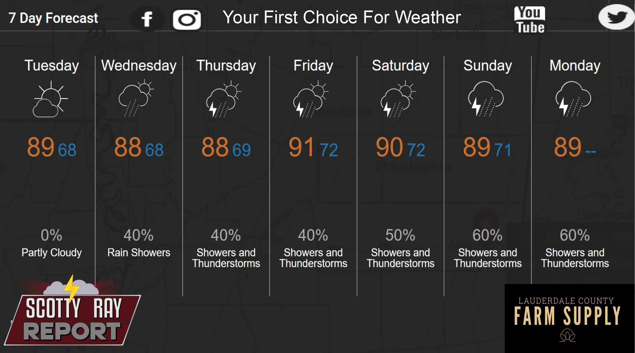 Rain and thunderstorms likely. Partly sunny, with a high near 89. Chance of precipitation is 60%.